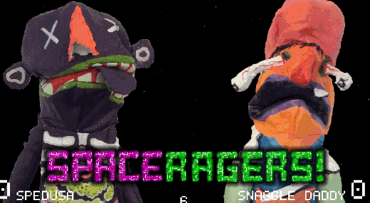 SpaceRagers is a two player boxing game where cosmic puppets pummel one another to settle the dispute of a multi-spaceship pile up. Each puppet has a series of sensors which trigger facial deterioration. After 3 rounds, the victor is decided by whoever has managed to cause the most damage or who has knocked their opponent's face off.